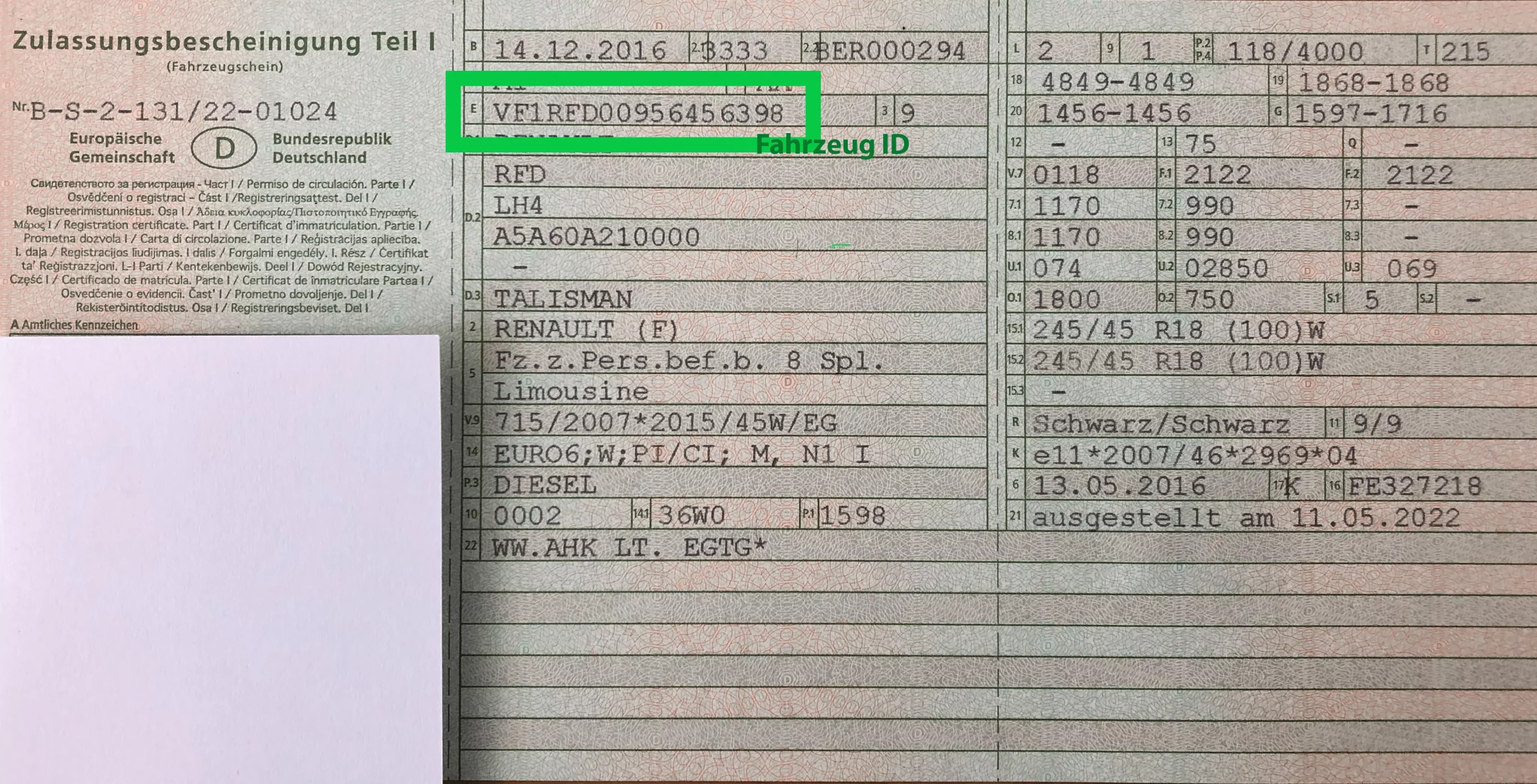 Der 7 stellige Sicherheitscode vom Fahrzeugschein Teil l befindet sich auf der Rückseite. Das grüne Siegel muss vorsichtig und vollständig freigelegt werden. Das Siegel kann entweder „freigerubbelt“ oder der Aufkleber, an der kleinen Ecke, abgezogen werden.